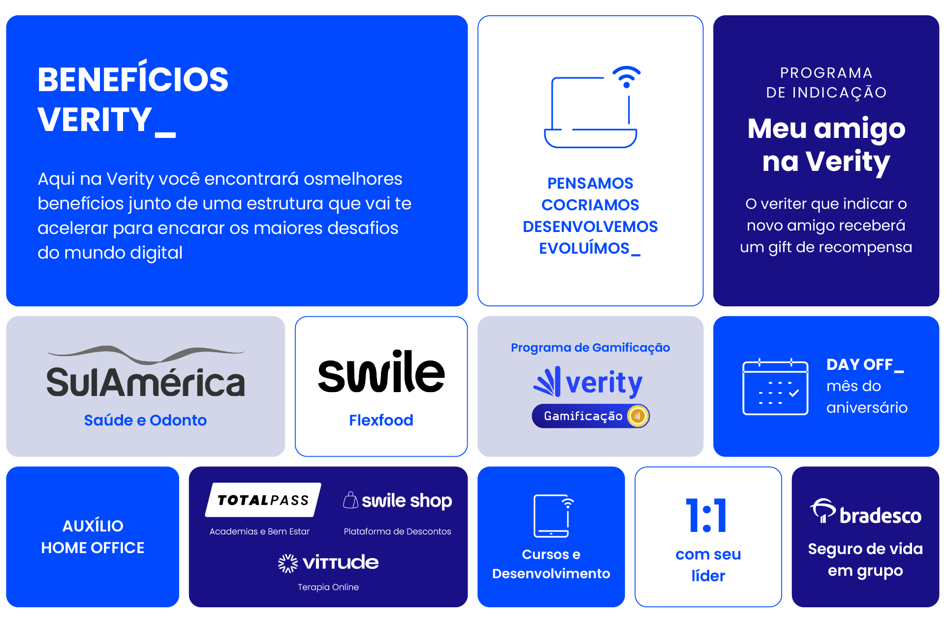 Ser Veriter é ter coragem para evoluir, pensar diferente e contribuir com insights antes nunca imaginados. Aqui na Verity você tem vale refeição e alimentação, assistência médica e odontológica, seguro de vida, parceria com a Total Pass para cuidar da saúde, auxílio home office, acesso a cursos para desenvolvimento, day off no aniversário e outras iniciativas que não param de surgir.